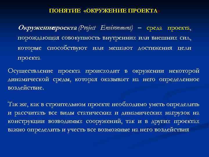 ПОНЯТИЕ «ОКРУЖЕНИЕ ПРОЕКТА» Окружение проекта (Project Environment) – среда проекта, порождающая совокупность внутренних или внешних сил, которые способствуют или мешают достижения цели проекта Осуществление проекта происходит в окружении некоторой динамической среды, которая оказывает на него определенное воздействие. Так же, как в строительном проекте необходимо уметь определить и рассчитать все виды статических и динамических нагрузок на конструкции возводимых сооружений, так и в других проектах важно определить и учесть все возможные на него воздействия