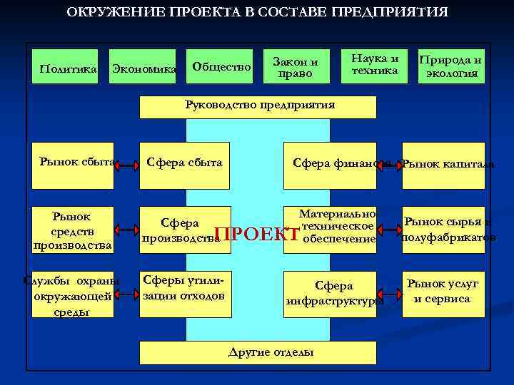ОКРУЖЕНИЕ ПРОЕКТА В СОСТАВЕ ПРЕДПРИЯТИЯ Политика Экономика Общество Закон и право Наука и техника Природа и экология Руководство предприятия Рынок сбыта Рынок средств производства Службы охраны окружающей среды Сфера сбыта Сфера финансов Рынок капитала Материально. Сфера техническое ПРОЕКТ обеспечение производства Сферы утилизации отходов Сфера инфраструктуры Другие отделы Рынок сырья и полуфабрикатов Рынок услуг и сервиса