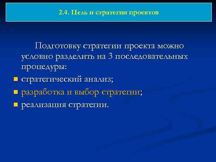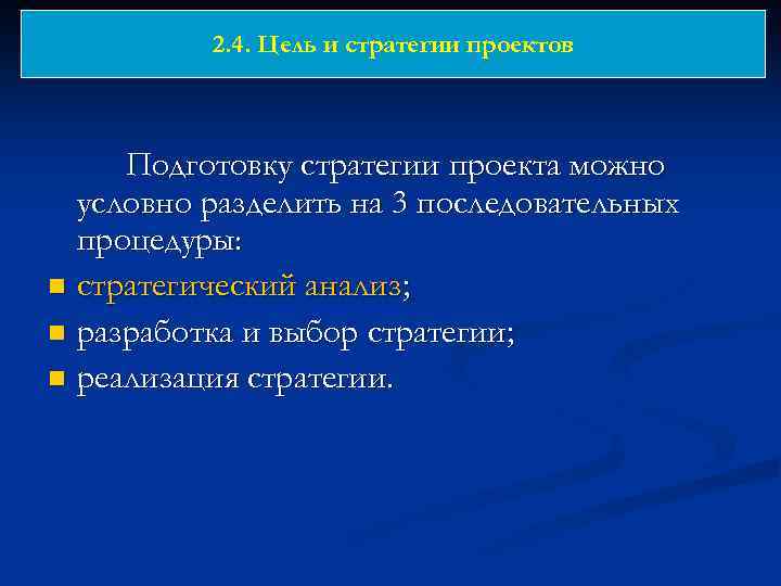 2. 4. Цель и стратегии проектов Подготовку стратегии проекта можно условно разделить на 3 последовательных процедуры: n стратегический анализ; n разработка и выбор стратегии; n реализация стратегии.