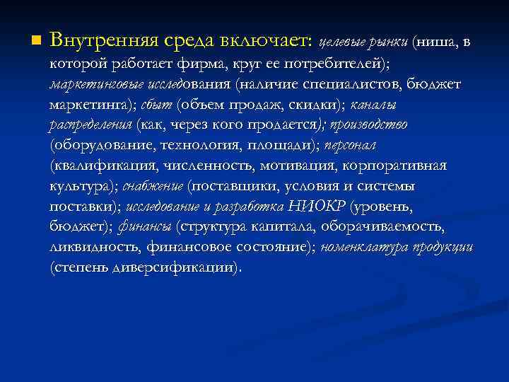n Внутренняя среда включает: целевые рынки (ниша, в которой работает фирма, круг ее потребителей); маркетинговые исследования (наличие специалистов, бюджет маркетинга); сбыт (объем продаж, скидки); каналы распределения (как, через кого продается); производство (оборудование, технология, площади); персонал (квалификация, численность, мотивация, корпоративная культура); снабжение (поставщики, условия и системы поставки); исследование и разработка НИОКР (уровень, бюджет); финансы (структура капитала, оборачиваемость, ликвидность, финансовое состояние); номенклатура продукции (степень диверсификации).