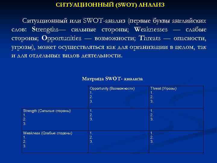 СИТУАЦИОННЫЙ (SWOT) АНАЛИЗ Ситуационный или SWOT-анализ (первые буквы английских слов: Strengths— сильные стороны; Weaknesses — слабые стороны; Opportunities — возможности; Threats — опасности, угрозы), может осуществляться как для организации в целом, так и для отдельных видов деятельности. Матрица SWOT- анализа Opportunity (Возможности) 1. 2. 3. Threat (Угрозы) 1. 2. 3. Strength (Сильные стороны) 1. 2. 3. Weakness (Слабые стороны) 1. 2. 3.