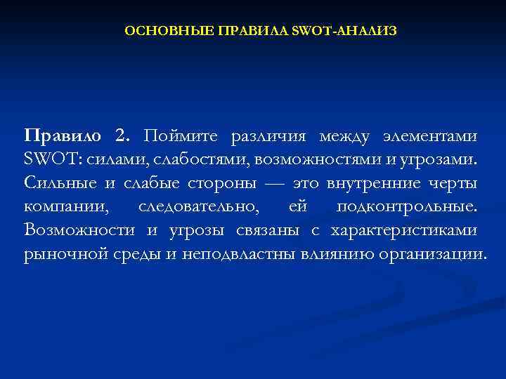 ОСНОВНЫЕ ПРАВИЛА SWOT-АНАЛИЗ Правило 2. Поймите различия между элементами SWOT: силами, слабостями, возможностями и угрозами. Сильные и слабые стороны — это внутренние черты компании, следовательно, ей подконтрольные. Возможности и угрозы связаны с характеристиками рыночной среды и неподвластны влиянию организации.