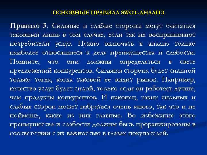 ОСНОВНЫЕ ПРАВИЛА SWOT-АНАЛИЗ Правило 3. Сильные и слабые стороны могут считаться таковыми лишь в том случае, если так их воспринимают потребители услуг. Нужно включать в анализ только наиболее относящиеся к делу преимущества и слабости. Помните, что они должны определяться в свете предложений конкурентов. Сильная сторона будет сильной только тогда, когда таковой ее видит рынок. Например, качество услуг будет силой, только если он работает лучше, чем продукты конкурентов. И наконец, таких сильных и слабых сторон может набраться очень много, так что и не поймешь, какие из них главные. Во избежание этого преимущества и слабости должны быть проранжированы в соответствии с их важностью в глазах покупателей.