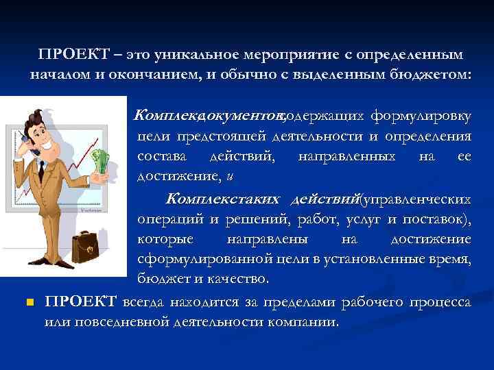 ПРОЕКТ – это уникальное мероприятие с определенным началом и окончанием, и обычно с выделенным бюджетом: Комплекс документов, содержащих формулировку n цели предстоящей деятельности и определения состава действий, направленных на ее достижение, и Комплекс таких действий (управленческих операций и решений, работ, услуг и поставок), которые направлены на достижение сформулированной цели в установленные время, бюджет и качество. ПРОЕКТ всегда находится за пределами рабочего процесса или повседневной деятельности компании.