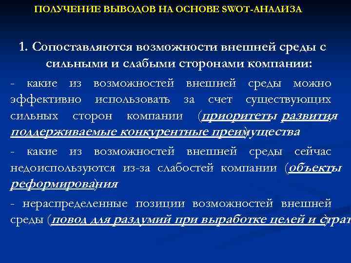 ПОЛУЧЕНИЕ ВЫВОДОВ НА ОСНОВЕ SWOT-АНАЛИЗА 1. Сопоставляются возможности внешней среды с сильными и слабыми сторонами компании: - какие из возможностей внешней среды можно эффективно использовать за счет существующих сильных сторон компании (приоритеты развития , поддерживаемые конкурентные преимущества ) - какие из возможностей внешней среды сейчас недоиспользуются из-за слабостей компании (объекты реформирования ) - нераспределенные позиции возможностей внешней среды (повод для раздумий при выработке целей и страт )