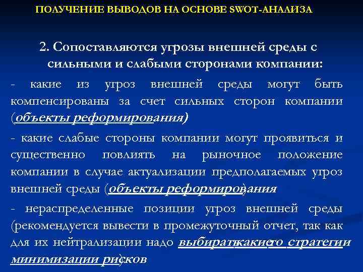 ПОЛУЧЕНИЕ ВЫВОДОВ НА ОСНОВЕ SWOT-АНАЛИЗА 2. Сопоставляются угрозы внешней среды с сильными и слабыми сторонами компании: - какие из угроз внешней среды могут быть компенсированы за счет сильных сторон компании (объекты реформирования) - какие слабые стороны компании могут проявиться и существенно повлиять на рыночное положение компании в случае актуализации предполагаемых угроз внешней среды (объекты реформирования ) - нераспределенные позиции угроз внешней среды (рекомендуется вывести в промежуточный отчет, так как для их нейтрализации надо выбирать какие стратегии то минимизации рисков ).
