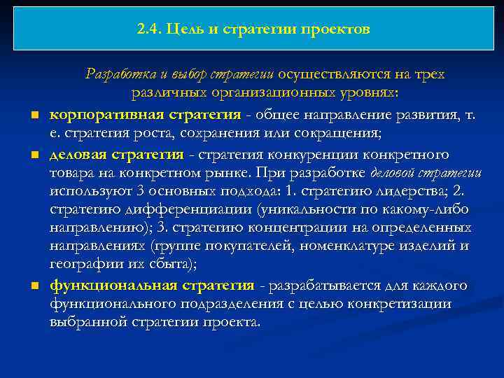 2. 4. Цель и стратегии проектов n n n Разработка и выбор стратегии осуществляются на трех различных организационных уровнях: корпоративная стратегия - общее направление развития, т. е. стратегия роста, сохранения или сокращения; деловая стратегия - стратегия конкуренции конкретного товара на конкретном рынке. При разработке деловой стратегии используют 3 основных подхода: 1. стратегию лидерства; 2. стратегию дифференциации (уникальности по какому-либо направлению); 3. стратегию концентрации на определенных направлениях (группе покупателей, номенклатуре изделий и географии их сбыта); функциональная стратегия - разрабатывается для каждого функционального подразделения с целью конкретизации выбранной стратегии проекта.