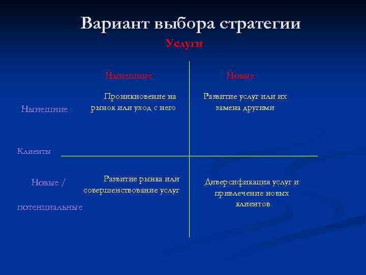 Вариант выбора стратегии Услуги Нынешние Проникновение на рынок или уход с него Новые Развитие услуг или их замена другими Клиенты Новые / потенциальные Развитие рынка или совершенствование услуг Диверсификация услуг и привлечение новых клиентов
