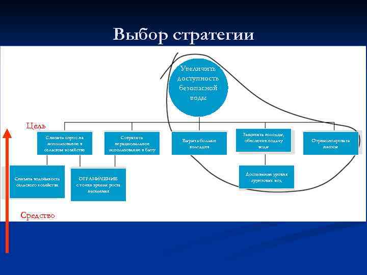 Выбор стратегии Увеличить доступность безопасной воды Цель Снизить спрос на использование в сельском хозяйстве Снизить водоёмкость сельского хозяйства Средство Сократить нерациональное использование в быту ОГРАНИЧЕНИЕ с точки зрения роста населения Вырыть больше колодцев Защитить колодцы, обеспечив подачу воды Достижение уровня грунтовых вод Отремонтировать насосы