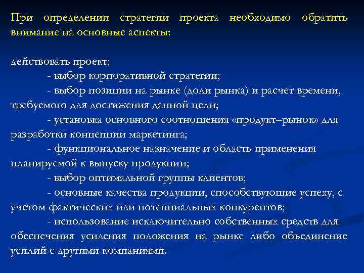 При определении стратегии проекта необходимо обратить внимание на основные аспекты: действовать проект; - выбор корпоративной стратегии; - выбор позиции на рынке (доли рынка) и расчет времени, требуемого для достижения данной цели; - установка основного соотношения «продукт–рынок» для разработки концепции маркетинга; - функциональное назначение и область применения планируемой к выпуску продукции; - выбор оптимальной группы клиентов; - основные качества продукции, способствующие успеху, с учетом фактических или потенциальных конкурентов; - использование исключительно собственных средств для обеспечения усиления положения на рынке либо объединение усилий с другими компаниями.