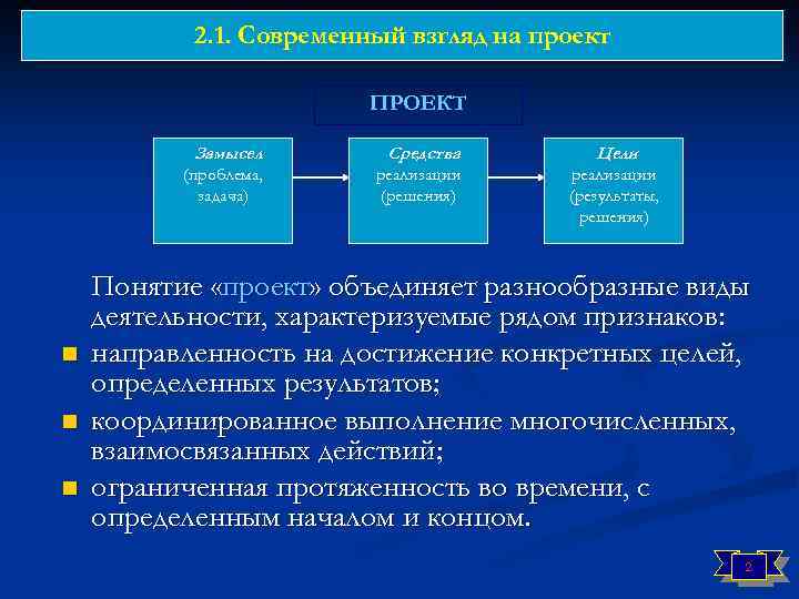 2. 1. Современный взгляд на проект ПРОЕКТ Замысел n n Цели (проблема, задача) n Средства реализации (решения) реализации (результаты, решения) Понятие «проект» объединяет разнообразные виды деятельности, характеризуемые рядом признаков: направленность на достижение конкретных целей, определенных результатов; координированное выполнение многочисленных, взаимосвязанных действий; ограниченная протяженность во времени, с определенным началом и концом. 2