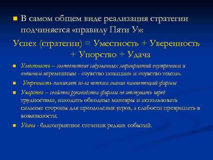 В самом общем виде реализация стратегии подчиняется «правилу Пяти У» : Успех (стратегии) = Уместность + Уверенность + Упорство + Удача n n n Уместность – соответствие задуманных мероприятий внутренним и внешним переменным - «чувство позиции» и «чувство темпа» . Уверенность возникает из-за четкого знания компетенций фирмы Упорство – свойство руководства фирмы не отступать перед трудностями, находить обходные маневры и использовать сильные стороны для преодоления угроз, а слабости превращать в возможности. Удача - благоприятное стечения редких событий.