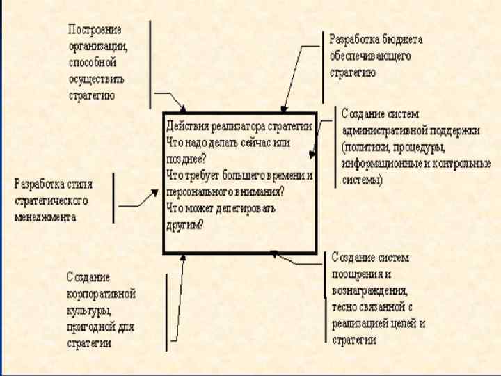 При реализации стратегии необходимо ответить на четыре вопроса: n Что будем делать? Формулирование целей деятельности. n Кто это будет делать? Разработка плана действий. n Почему они это будут делать? Бюджет и мотивация. n Как это будет делаться? Процедуры действий.
