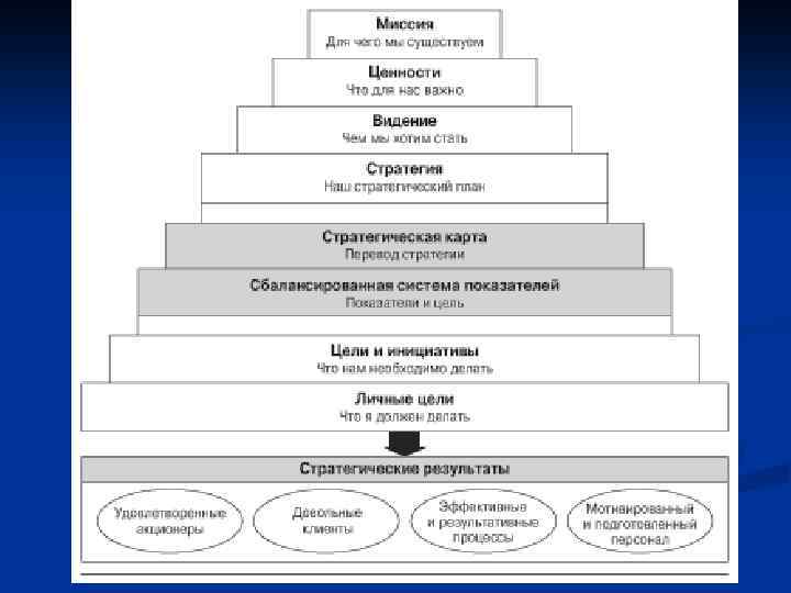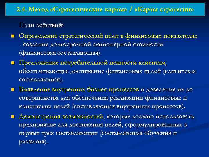 2. 4. Метод «Стратегические карты» / «Карты стратегии» n n План действий: Определение стратегической цели в финансовых показателях - создание долгосрочной акционерной стоимости (финансовая составляющая). Предложение потребительной ценности клиентам, обеспечивающее достижение финансовых целей (клиентская составляющая). Выявление внутренних бизнес-процессов и доведение их до совершенства для обеспечения реализации финансовых и клиентских целей (составляющая внутренних процессов). Демонстрация возможностей, которые должно использовать предприятие для достижения целей, сформулированных в первых трех составляющих (составляющая обучения и развития).