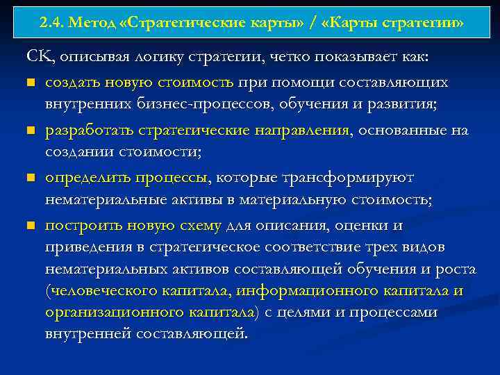 2. 4. Метод «Стратегические карты» / «Карты стратегии» СK, описывая логику стратегии, четко показывает как: n создать новую стоимость при помощи составляющих внутренних бизнес-процессов, обучения и развития; n разработать стратегические направления, основанные на создании стоимости; n определить процессы, которые трансформируют нематериальные активы в материальную стоимость; n построить новую схему для описания, оценки и приведения в стратегическое соответствие трех видов нематериальных активов составляющей обучения и роста (человеческого капитала, информационного капитала и организационного капитала) с целями и процессами внутренней составляющей.