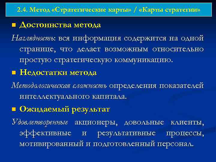 2. 4. Метод «Стратегические карты» / «Карты стратегии» Достоинства метода Наглядность: вся информация содержится на одной странице, что делает возможным относительно простую стратегическую коммуникацию. n Недостатки метода Методологическая сложность определения показателей интеллектуального капитала. n Ожидаемый результат Удовлетворенные акционеры, довольные клиенты, эффективные и результативные процессы, мотивированный и подготовленный персонал. n