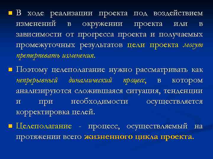 n В ходе реализации проекта под воздействием изменений в окружении проекта или в зависимости от прогресса проекта и получаемых промежуточных результатов цели проекта могут претерпевать изменения. n Поэтому целеполагание нужно рассматривать как непрерывный динамический процесс, в котором анализируются сложившаяся ситуация, тенденции и при необходимости осуществляется корректировка целей. n Целеполагание - процесс, осуществляемый на протяжении всего жизненного цикла проекта.