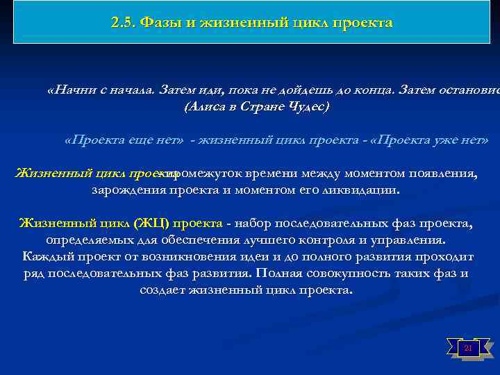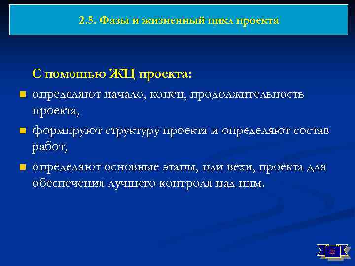 2. 5. Фазы и жизненный цикл проекта «Начни с начала. Затем иди, пока не дойдешь до конца. Затем остановис (Алиса в Стране Чудес) «Проекта еще нет» - жизненный цикл проекта - «Проекта уже нет» Жизненный цикл проекта - промежуток времени между моментом появления, зарождения проекта и моментом его ликвидации. Жизненный цикл (ЖЦ) проекта - набор последовательных фаз проекта, определяемых для обеспечения лучшего контроля и управления. Каждый проект от возникновения идеи и до полного развития проходит ряд последовательных фаз развития. Полная совокупность таких фаз и создает жизненный цикл проекта. 21