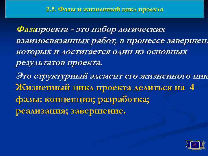 2. 5. Фазы и жизненный цикл проекта n n n С помощью ЖЦ проекта: определяют начало, конец, продолжительность проекта, формируют структуру проекта и определяют состав работ, определяют основные этапы, или вехи, проекта для обеспечения лучшего контроля над ним. 22