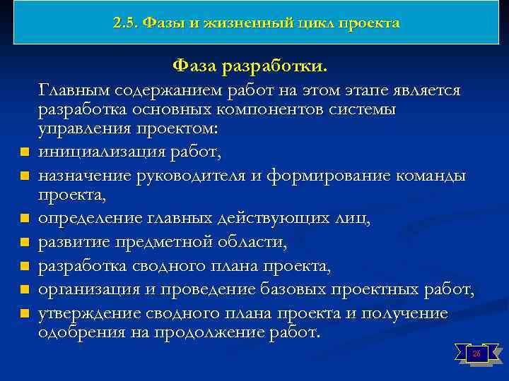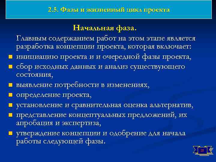 2. 5. Фазы и жизненный цикл проекта n n n n Начальная фаза. Главным содержанием работ на этом этапе является разработка концепции проекта, которая включает: инициацию проекта и и очередной фазы проекта, сбор исходных данных и анализ существующего состояния, выявление потребности в изменениях, определение проекта, установление и сравнительная оценка альтернатив, представление концептуальных предложений, их апробация и экспертиза, утверждение концепции и одобрение для начала работы следующей фазы. 25