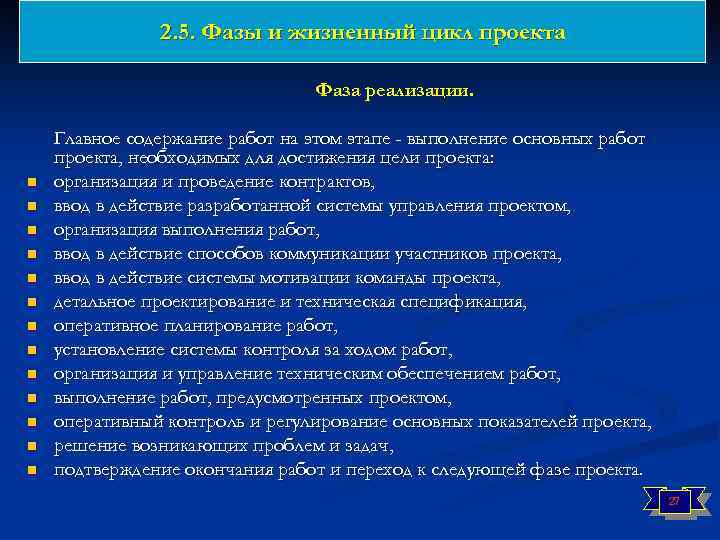 2. 5. Фазы и жизненный цикл проекта n n n n Фаза разработки. Главным содержанием работ на этом этапе является разработка основных компонентов системы управления проектом: инициализация работ, назначение руководителя и формирование команды проекта, определение главных действующих лиц, развитие предметной области, разработка сводного плана проекта, организация и проведение базовых проектных работ, утверждение сводного плана проекта и получение одобрения на продолжение работ. 26