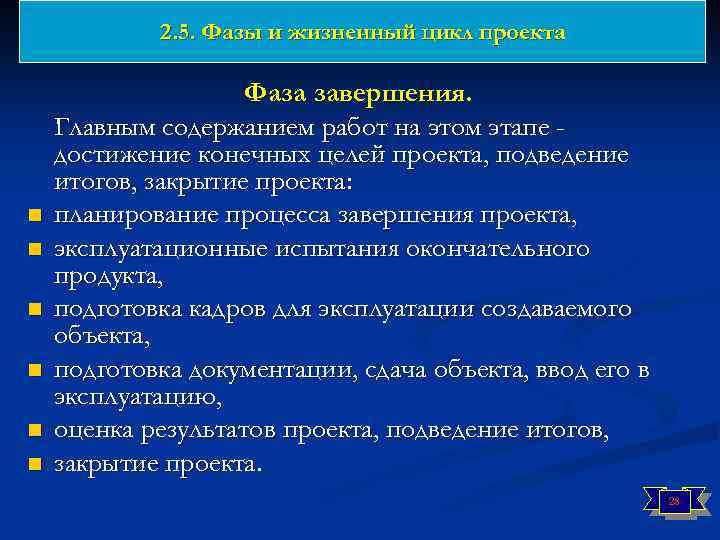 2. 5. Фазы и жизненный цикл проекта Фаза реализации. n n n n Главное содержание работ на этом этапе - выполнение основных работ проекта, необходимых для достижения цели проекта: организация и проведение контрактов, ввод в действие разработанной системы управления проектом, организация выполнения работ, ввод в действие способов коммуникации участников проекта, ввод в действие системы мотивации команды проекта, детальное проектирование и техническая спецификация, оперативное планирование работ, установление системы контроля за ходом работ, организация и управление техническим обеспечением работ, выполнение работ, предусмотренных проектом, оперативный контроль и регулирование основных показателей проекта, решение возникающих проблем и задач, подтверждение окончания работ и переход к следующей фазе проекта. 27