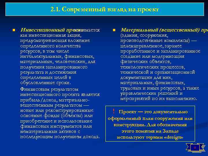 2. 1. Современный взгляд на проект n Инвестиционный проект понимается как инвестиционная акция, предусматривающая вложение определенного количества ресурсов, в том числе интеллектуальных, финансовых, материальных, человеческих, для получения запланированного результата и достижения определенных целей в обусловленные сроки. Финансовым результатом инвестиционного проекта является прибыль/доход, материальновещественным результатом — новые или реконструированные основные фонды (объекты) или приобретение и использование финансовых инструментов или нематериальных активов с последующим получением дохода. n Материальный (вещественный) про (здания, сооружения, производственные комплексы) — целенаправленное, заранее проработанное и запланированное создание или модернизация физических объектов, технологических процессов, технической и организационной документации для них, материальных, финансовых, трудовых и иных ресурсов, а также управленческих решений и мероприятий по их выполнению. ! Проект — это документально оформленный план сооружения или конструкции. Для обозначения этого понятия на Западе используют термин «design» 4