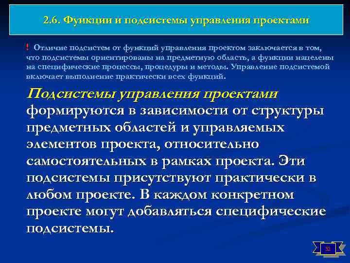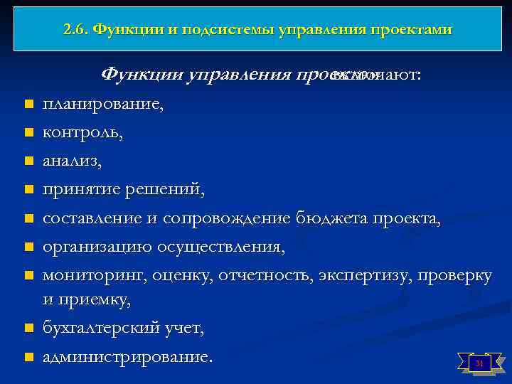 2. 6. Функции и подсистемы управления проектами Функции управления проектом включают: n n n n n планирование, контроль, анализ, принятие решений, составление и сопровождение бюджета проекта, организацию осуществления, мониторинг, оценку, отчетность, экспертизу, проверку и приемку, бухгалтерский учет, администрирование. 31