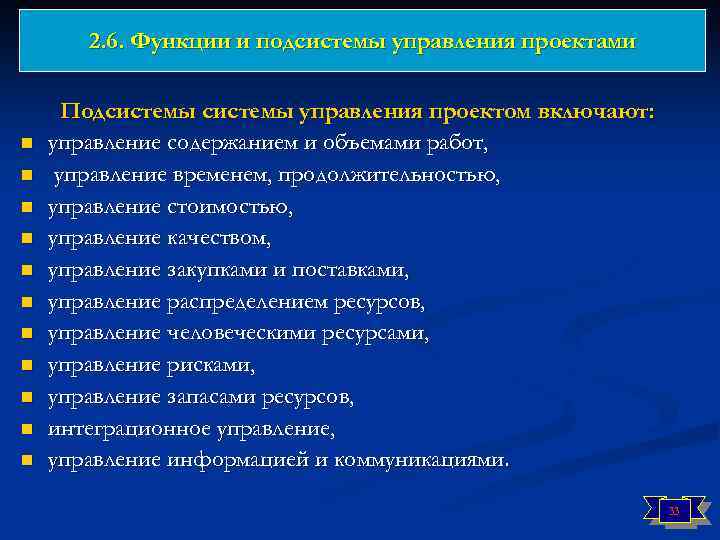 2. 6. Функции и подсистемы управления проектами ! Отличие подсистем от функций управления проектом заключается в том, что подсистемы ориентированы на предметную область, а функции нацелены на специфические процессы, процедуры и методы. Управление подсистемой включает выполнение практически всех функций. Подсистемы управления проектами формируются в зависимости от структуры предметных областей и управляемых элементов проекта, относительно самостоятельных в рамках проекта. Эти подсистемы присутствуют практически в любом проекте. В каждом конкретном проекте могут добавляться специфические подсистемы. 32