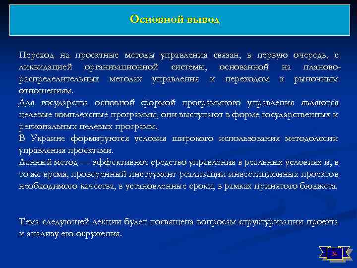 Основной вывод Переход на проектные методы управления связан, в первую очередь, с ликвидацией организационной системы, основанной на плановораспределительных методах управления и переходом к рыночным отношениям. Для государства основной формой программного управления являются целевые комплексные программы, они выступают в форме государственных и региональных целевых программ. В Украине формируются условия широкого использования методологии управления проектами. Данный метод — эффективное средство управления в реальных условиях и, в то же время, проверенный инструмент реализации инвестиционных проектов необходимого качества, в установленные сроки, в рамках принятого бюджета. Тема следующей лекции будет посвящена вопросам структуризации проекта и анализу его окружения. 34