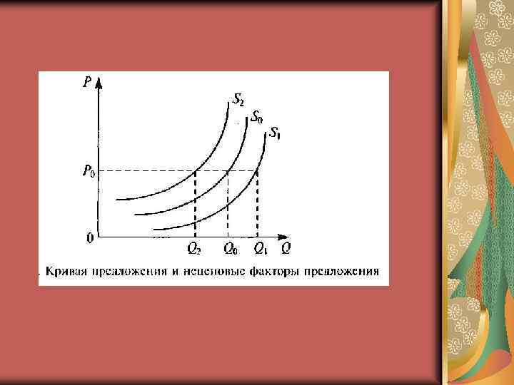Предложение – желание предложить товар на рынке Величина предложения – количество товара… Фукнция предложения – зависимость…Qs= с + d. P (c, d – численные коэффициенты) Кривая предложения (издержки, выгода) Закон предложения – прямо пропорциональная зависимость между величиной предложения и ценой Изменение предложения – сдвиг кривой предложения Изменение величины предложения – сдвиг по кривой предложения Неценовые детерминанты предложения (технология, цена факторов производства, число продавцов, прогнозы, погода)