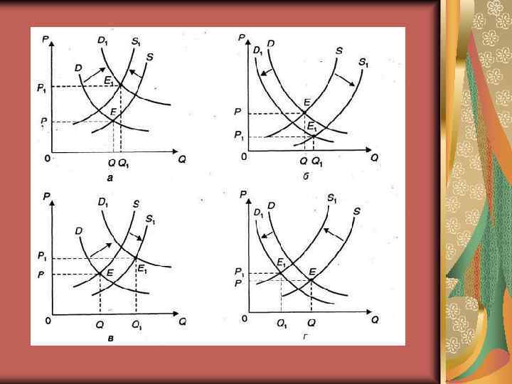 Рыночное равновесие – кривые пересекаются, пара «цена-количество» , которая удовлетворяет выгоды и издержки и покупателя, и производителя Избыточное предложение – цена выше равновесного значения (количество товара на рынке находится на кривой спроса) – цена оказывает понижающее давление через конкуренцию производителей Избыточный спрос – цена ниже равновесного значения (количество товара на рынке находится на кривой предложения) – цена оказывает повышающее давление через конкуренцию потребителей