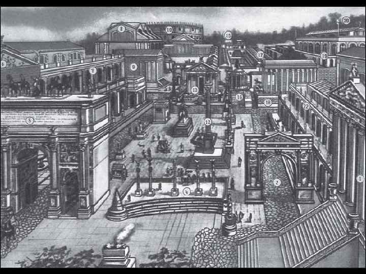 Рим. Форум Романум. : Храм Сатурна. 2. Священная дорога. 3. Храм Веспасиана. 4. Ростры. 5. Арка Септимия Севера. 6. Курия. 7. Базилика Эмилия. 8. Базилика Максенция. 9. Храм Антонина и Фаустины. 10. Колизей. 11. Круглый храм Ромула. 12. Колонна Фокаса