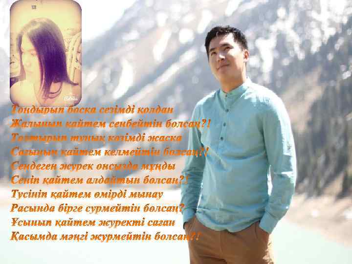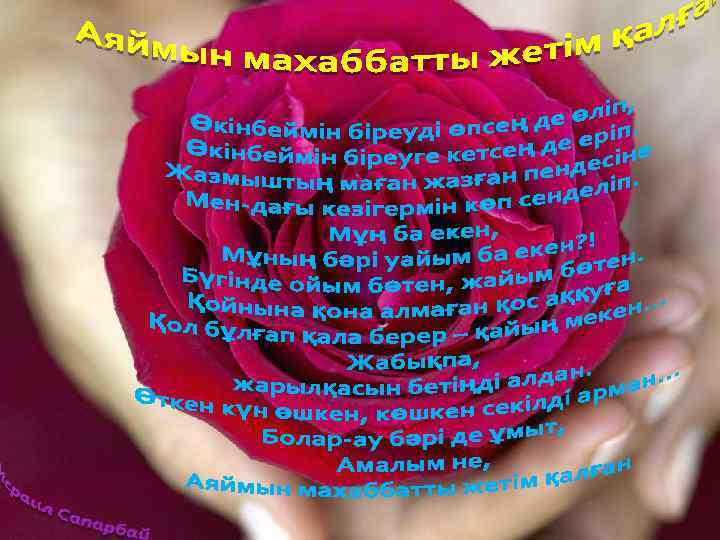 Жанымда емес, жүрегімде барсың. Қасымда емес, ойымда барсың. Күнде сені көрмесемде, Аллаға шүкір дүниеде барсың. . .