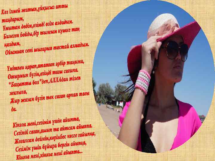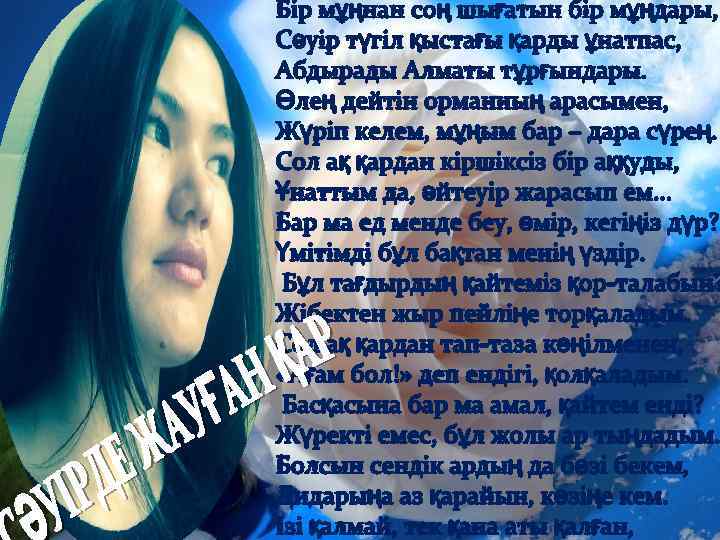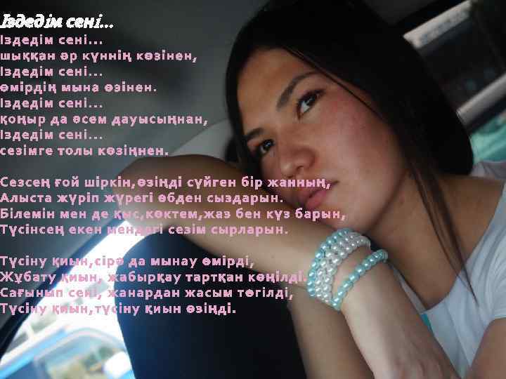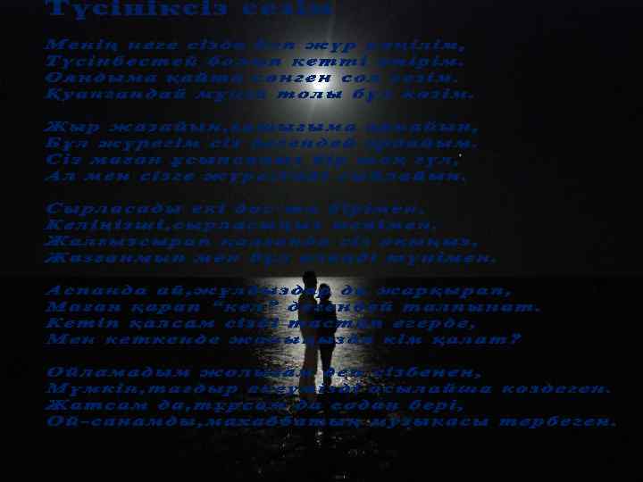 Түсім десем ояу едім, Әлдеқашан таң атқан. Өңім неткен баяу едің, Тоқтатты ма жаратқан? ! Бұл кім өзі, Таң нұрымен шағылысып, мені өзіне қаратқан? ? ? Көңілімді баурап алды, Бас алмаушы ем сабақтан. Бір шапағат жүрекке енді, Күлімдеді ол маған. Бір жаңалық ашты жаным, Бұрын сонды болмаған. Баурап алды күлкісімен, Жіпсіз оған байландым. Оқымысты қара қыздан Ғашық жанға айналдым. Әдетінше тастамадым Дәптер менен қаламды. Бірақ сабақ жайға қалды, Өлең жаздым адам жайлы, жаулап алған санамды. Алғашқы рет мен өзімді, Бақыттымын деп ұқтым. О, жігітім, жастарша айтсам, Мен өзіңе сыныппын. Жүре к м ендік, б ірақ ж ылу сен ік і, Жүрек бір ақ жылу сенік Бар ж ылуын жаным саған бер іпті. жылуын ж аны м с аған іпті. Сенің көзі ң айдан асы л көрі кт і. көзің ай дан кө рікт Ме ні ң ж аным сенікіне к өл еңке боп жаным се ні кіне көле ңк е ері пті. еріп ті. Бұл мах аб бат, есік қақ пай кел еті н, м ахабб ат, ес ік қақпай к ел етін, Ұлы с езім тандамайт ы н санатт ы. сезім тандамайты Білесі ң б е? Біле сі бе ? Тік қарас ың, ж ымиы сың , тұр ы сың , қа расың , жы миы сы ң, тұры сы ң, Осы үш нәрсе мені ө зі не қарат ты. . . нә рсе өзіне қаратт ы. . . Сен ж ымисаң , мен қуандым, ым исаң, қуан ды м, Сен м ұңайсаң, мен жылаң ды м. мұң ай са ң, жы лаңды Білесі ң б е, өзіңе бір Алладан Біле сі бе , өзі ңе б ір Бақыт бе р деп сұр ан ды м. Бақ ыт б ер сұранды Әтте ң, әттең, сен біл мей сің, әтте ң, б ілмейсің , Ме нде бұқ қа н с езі мді. б ұқ қан сезімді. Әтте ң, жі ті түс ің бей сің, түсіңб ейсің , Әрбір айтқан сөзімді. . . айтқ ан сөзі мді. . . Айта алмайм ын т ік өзі ңе, алм айм өзіңе, Қыздық намыс жібе рмей ді мендегі. Қызд ық нам ыс жібер мейді Ме н с езем ін, сенде де б ар бір сезем с енде бар ұшқын, ұшқ ын, Енді ертерек ай тыл са екен ж ыл ы айт ылс а ек ен жы лы леб із сенде гі. лебі з с ендегі. Сен б олмас аң жан ж ыл ымас , сор олм асаң жы лы мас, с ор ма ған. маға н. Саға н ж азған ә рб ір буы н ж ыр енді. Саған әр бір буын жы р Тас қа малд ың ж үрегімді т орлаған қама лдың жүр егімді торл аған Кілті өзің де өзің ашып кір ен ді. . . ашы п к ір енді. . .