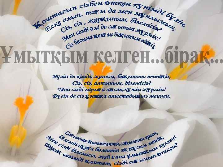 ен, сіңг н. р ы нұ сымме мд ары ы тыл жел, ан де ж ан атт самал ен. ей ып к нда арм еткенде күрсінг Жұм асқа п п л ан ү ығар де , Сыр ртымн н ш өлек б хал ек. у сы ймін се Т ағы еңде ынд н ән кер м, ас Ел ың б илейті н ояна н на . жан ы әлд ық анд ылы н бе деп рс Ғаш қ ж а ты қан се , ы с аман Ғаш ыр жау ік қақ р й жү ан. аңб ліп ес ме Ж көр сұрам п ке ғы Ізде қай а тілек іс су, н олсы н басқ се күм м. н б аша ғдырда мбірле й қуана Қ де та кү Мен стында естілген і, а Күн күлкің кінш күлші. өт ің ғар , көп күн, Сен шы өте қуаншы ай мен н і. ы деге а көп мір ырд ндағ өтсінш Ө спа ғұм ұқсап а қ болып Аз аған ңе ғашы М рі өзде К