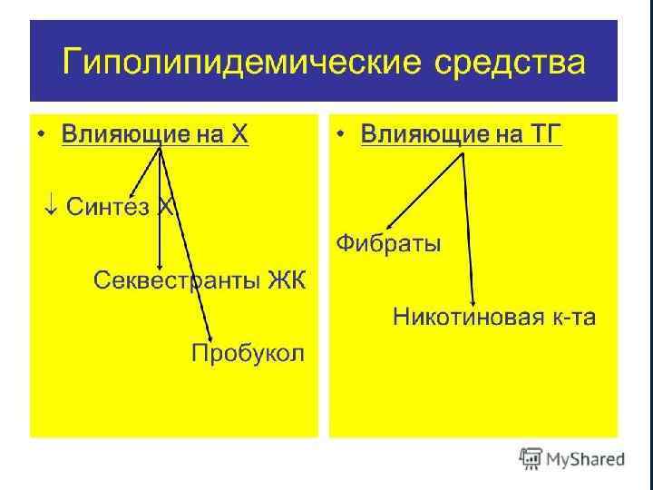 • Атеросклероз және оның асқынуларының (ЖИА, инсульт, стенокардия және т. б. ) алдын алу және емдеу үшін қолданылатын препараттардың ең бір маңызды компонеттері гиполипидемиялық заттар. Негізгі әсері қан сарысуында мөлшері жоғарлаған атерогенді липопротеиндерді төмендету, антиатерогенді липопротеиндерді жоғарлату. липопротеинде р хиломикрондар ӨТТЛП АТЛП ТТЛП ЖТЛП