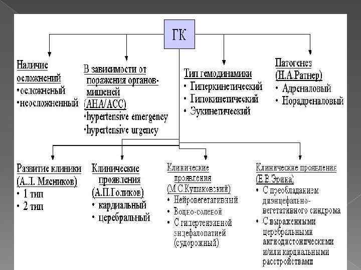 Жіктелуі (JNC-6) ГК ағымы бойынша : 1. Асқынған (критикалық, emergency) ми, коронарлы, бүйректік қан айналымның нашарлау белгілері. Алғашқы минутта және сағат көлемінде парентеральді заттармен АҚ төмендету. 2. Асқынбаған (критикалық емес, urgency) нысына- мүшелердің зақымдалу белгілері жоқ. Тек алғашқы бірнеше сағат ішінде АҚ салыстырмалы жедел түсіру. асқынбаған ГК формалары: 1. Нейровегетативті. 2. су-тұзды. 3. Қалтыраған.