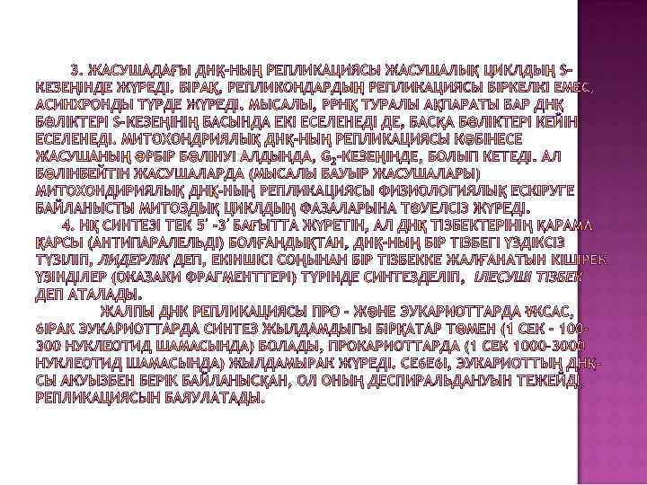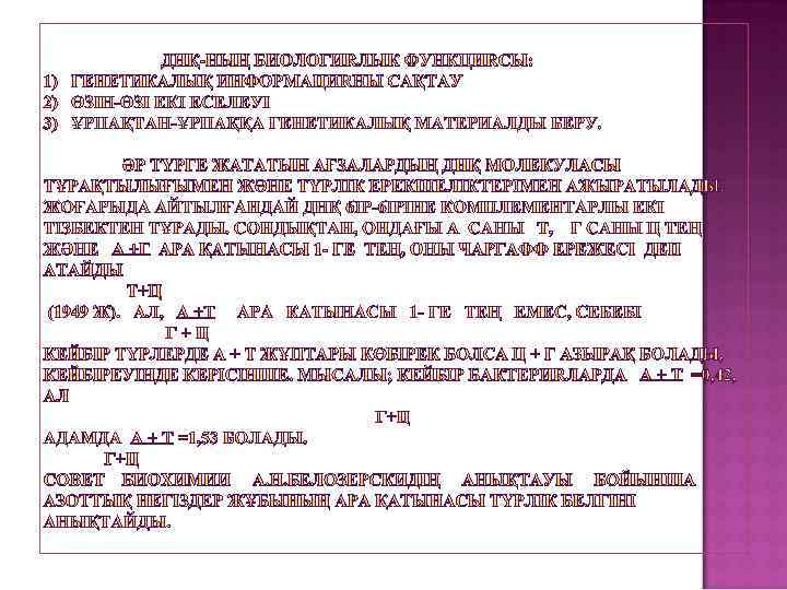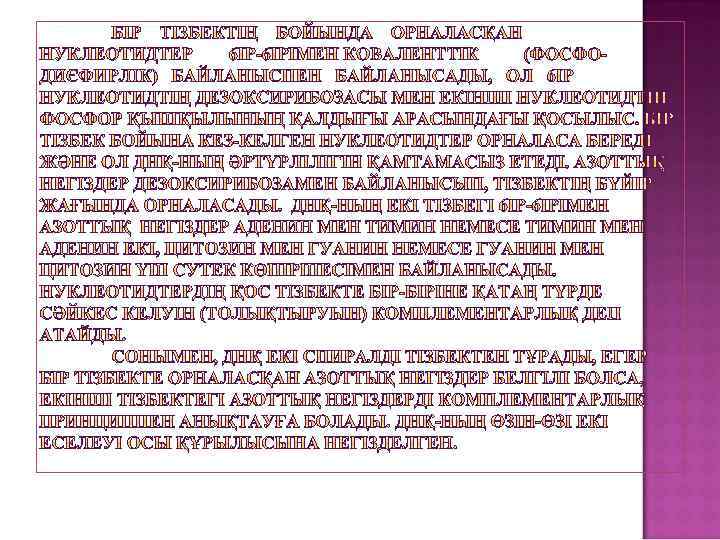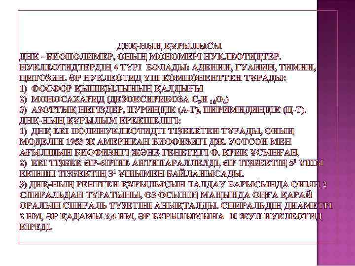 ЖОСПАРЫ: 1. НУКЛЕИН ҚЫШҚЫЛДАРЫ, ТҮРЛЕРІ, ҚЫЗМЕТТЕРІ, ХИМИЯЛЫҚ ҚҰРАМЫ. 2. НУКЛЕОТИД ҚҰРЫЛЫСЫ. ПОЛИНУЛЕОТИДТІК ТІЗБЕКТІҢ ҚҰРЫЛУЫ. НУКЛЕОТИДТІК ТІЗБЕКТЕРДІҢ БАҒЫТЫ. 3. ДНҚ-НЫҢ НУКЛЕОТИДТІК ҚҰРАМЫ. ТҮРЛІК ЕРЕКШЕЛІГІ. ЧАРГАФФА ЕРЕЖЕСІ. БИОЛОГИЯЛЫҚ МАҢЫЗЫ. 4. РНҚ-НЫҢ ДНҚ-ДАН АЙЫРМАШЫЛЫҒЫ.