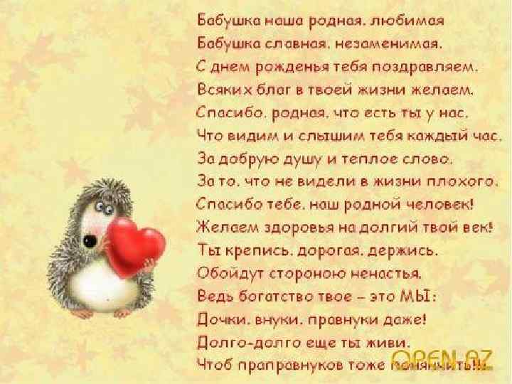 В День рожденья бабушки родной Пусть цветут сады, и будет лето, Ведь ее безбрежной добротой Все вокруг давным-давно согрето!