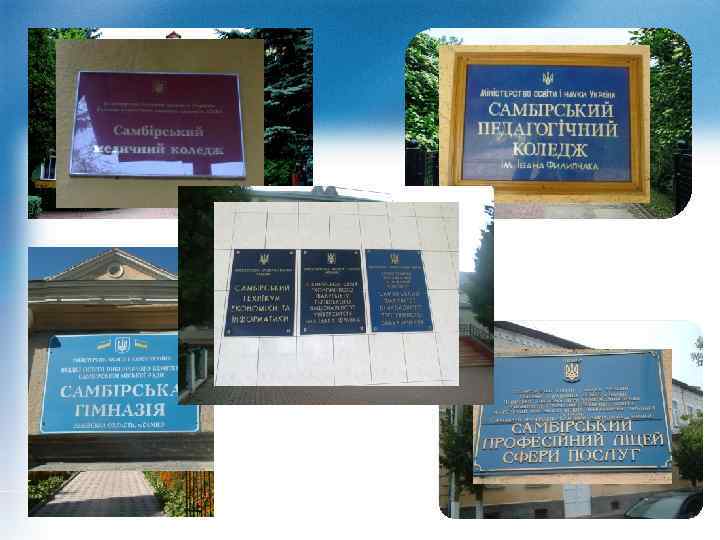 Освіта В 2012 році у Самборі нараховувалось 8 шкіл. В місті діє спецшкола – інтернат, в якій навчається 165 дітей. В загальному, мережа шкіл є оптимальною, хоча деякі школи вимагають реформування. у зв’язку з цим на базі СШ № 9 було створено НК «ДНЗ-ЗНЗ» . В Самборі функціонують наступні позашкільні заклади: музична школа, міський будинок учнівської творчості, дитячо-юнацька технічна школа, станція юних натуралістів, дитячо-юнацька спортивна школа, мала академія наук. В Самборі діють: медичний коледж, педагогічний коледж, училище культури. технікум економіки та інформатики, професійний політехнічний ліцей, професійний ліцей сфери послуг, училище швейників. На базі СТЕТІ відкрито факультет прикладного програмного забезпечення Тернопільської академії народного господарства, філіал економічного факультету Львівського національного університету ім. І. Франка.