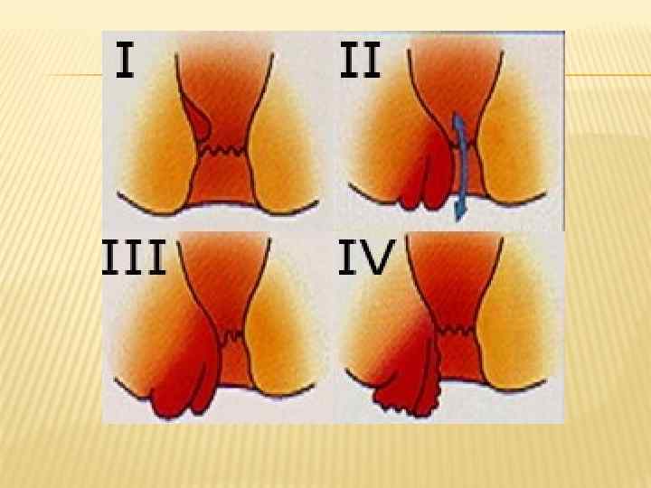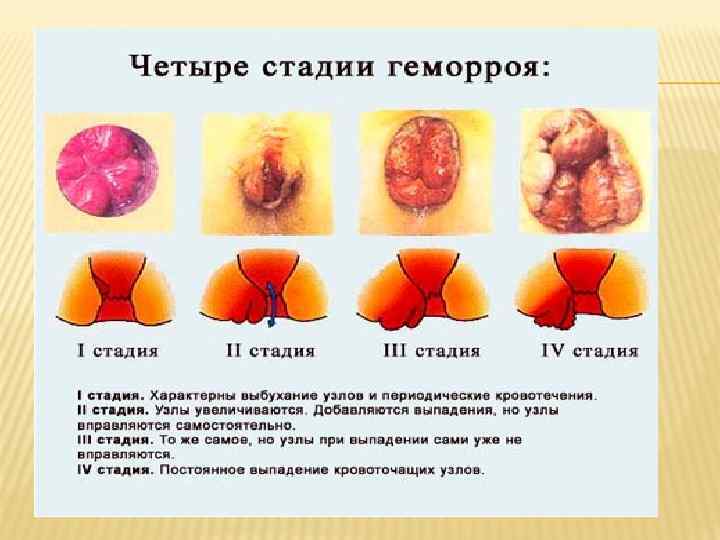 КЛИНИКАЛЫҚ КӨРІНІСІ Алғашқы дәрежесінде аnus аймағындағы қолайсыз сезімдер, жеңіл дәрежелі қышыма сезімдері, дефекация процессінің қиындауы. Келесі дәрежелерінде ауру сезімі, anus тан қан кету болады. Қан кету жоғары дәрежеге жетіп, әлсіздік, анемия белгілері пайда болады.