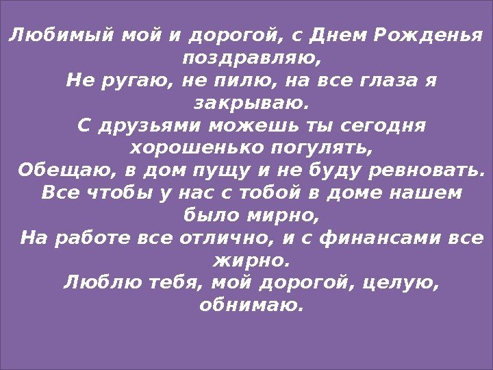 Любимый мой и дорогой, с Днем Рожденья поздравляю, Не ругаю, не пилю, на все глаза я закрываю. С друзьями можешь ты сегодня хорошенько погулять, Обещаю, в дом пущу и не буду ревновать. Все чтобы у нас с тобой в доме нашем было мирно, На работе все отлично, и с финансами все жирно. Люблю тебя, мой дорогой, целую, обнимаю.