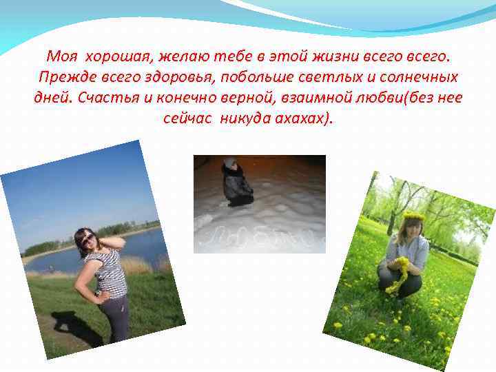 Моя хорошая, желаю тебе в этой жизни всего. Прежде всего здоровья, побольше светлых и солнечных дней. Счастья и конечно верной, взаимной любви(без нее сейчас никуда ахахах).
