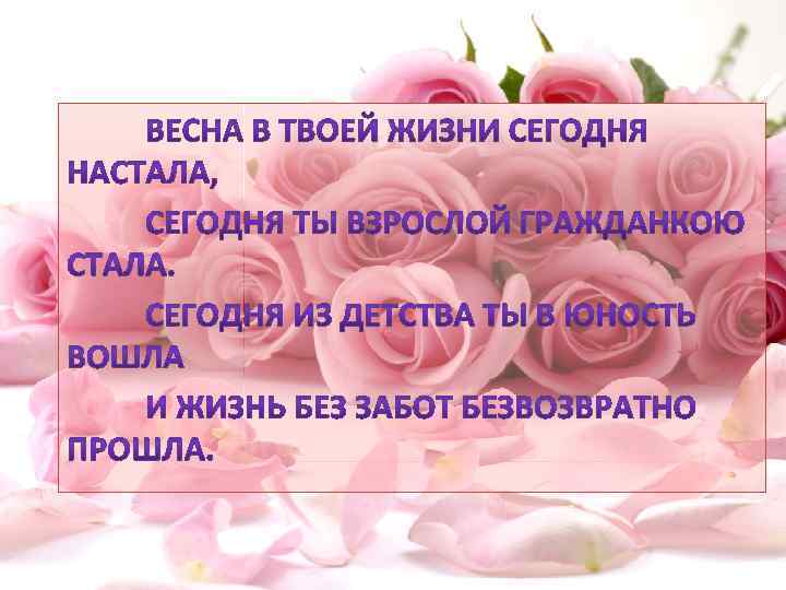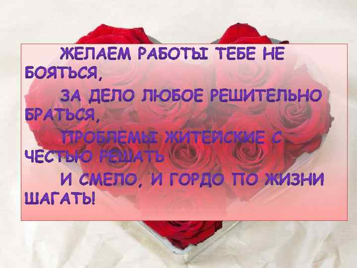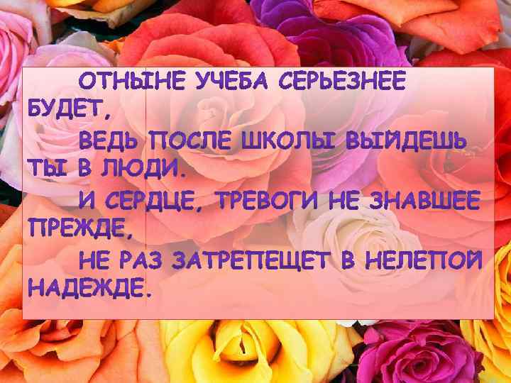 Душа поет, сердце вырывается из груди, глаза блестят, а в голове лишь ветра свист. Пускай это состояние приносит тебе только радость и никогда не доводит до слез. Живи, учись, люби, расти, твори, ведь это именно то время, когда нельзя останавливаться ни на минуты. Желаем новых ощущений, встреч с интересными людьми и искренней любви.