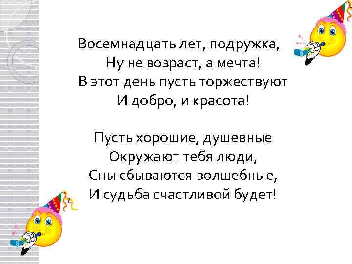 Восемнадцать лет, подружка, Ну не возраст, а мечта! В этот день пусть торжествуют И добро, и красота! Пусть хорошие, душевные Окружают тебя люди, Сны сбываются волшебные, И судьба счастливой будет!