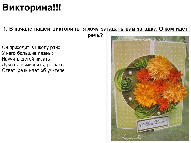 Викторина!!! 1. В начале нашей викторины я хочу загадать вам загадку. О ком идёт речь? Он приходит в школу рано, У него большие планы: Научить детей писать, Думать, вычислять, решать. Ответ: речь идёт об учителе