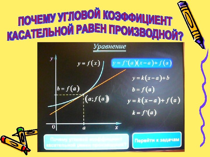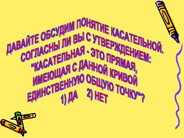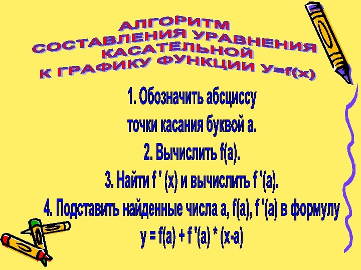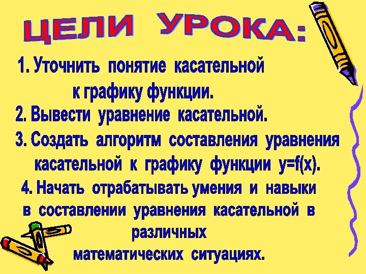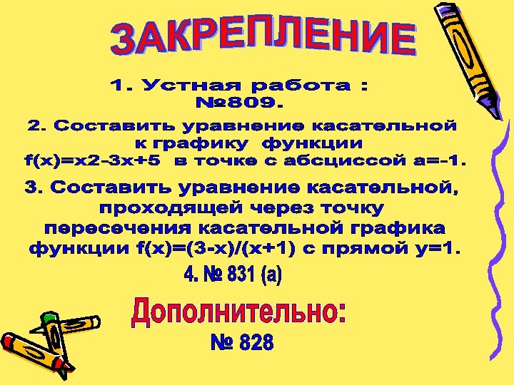 А. КАСАТЕЛЬНАЯ, ПРОВЕДЕННАЯ К ГРАФИКУ ФУНКЦИИ У=Х³-Х В ТОЧКЕ С АБСЦИССОЙ Х=0, ПАРАЛЛЕЛЬНА ПРЯМОЙ: 1) У=7 -Х 2) У=Х-7 3) У=2 Х-7 4) У=√ 3*Х+7 А. ДЛЯ ФУНКЦИИ У=4 Х-Х² КАСАТЕЛЬНАЯ, ПАРАЛЛЕЛЬНАЯ ОСИ АБСЦИСС, ПРОВЕДЕНА ЧЕРЕЗ ТОЧКУ КАСАНИЯ: 1) (0; 0) 2) (4; 0) 3) (2; 4) 4) (-1; -5) А. УРАВНЕНИЕ КАСАТЕЛЬНОЙ К ГРАФИКУ ФУНКЦИИ f(x)= 2 х²-3 х-1, ПРОВЕДЕННОЙ В ТОЧКЕ С АБСЦИССОЙ Х 0=1, ИМЕЕТ ВИД: 1)У=Х-3 2) У=Х-1 3) У=-2 Х+3 4) 6 У=-11 Х-1 А. УРАВНЕНИЕ КАСАТЕЛЬНОЙ, ПРОВЕДЕННОЙ К ГРАФИКУ ФУНКЦИИ f (х)= 3 х²-2 х+5 В ТОЧКЕ А(2; 13): 1) У=76 Х-502 2) У=10 Х-7 3) У=10 Х+33 4) У=76 Х-139 А. НАЙТИ ТАНГЕНС УГЛА НАКЛОНА КАСАТЕЛЬНОЙ, ПРОВЕДЕННОЙ К ГРАФИКУ ФУНКЦИИ У= 3 Х²-5 Х В ТОЧКЕ С АБСЦИССОЙ Х 0=2. 1) 0, 83 2) 2 3)3 4) 7