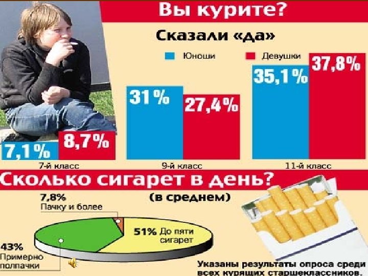Статистические данные: табакокурение снижает продолжительность жизни на 10 -15 лет (ежедневно на 15 минут); по данным ВОЗ, каждый третий умирающий в мире – жертва алкоголя, а каждый пятый – жертва табака; в России курит половина мужчин и десятая часть женщин; токсичность табачного дыма в 4, 5 раза превышает токсичность выхлопных газов автомобиля; при табакокурении: 25% вредных веществ табачного дыма сгорают, 25% поглощает сам курильщик, 50% - отравляют воздух в помещении; средний возраст умерших от сердечных приступов – 67 лет, а у курильщиков – 47 лет; из 100 больных туберкулезом: 95 – курильщики; если в семье курят оба родителя, то дети вдыхают такое количество никотина, которое получали бы, если бы сами выкуривали по 80 сигарет в год; жены курильщиков живут на 4 года меньше, чем жены некурящих мужчин; некурящему достаточно 1 час провести в накуренном помещении, чтобы в его организм попали все вредные вещества в количестве, которое содержится в одной выкуренной сигарете.