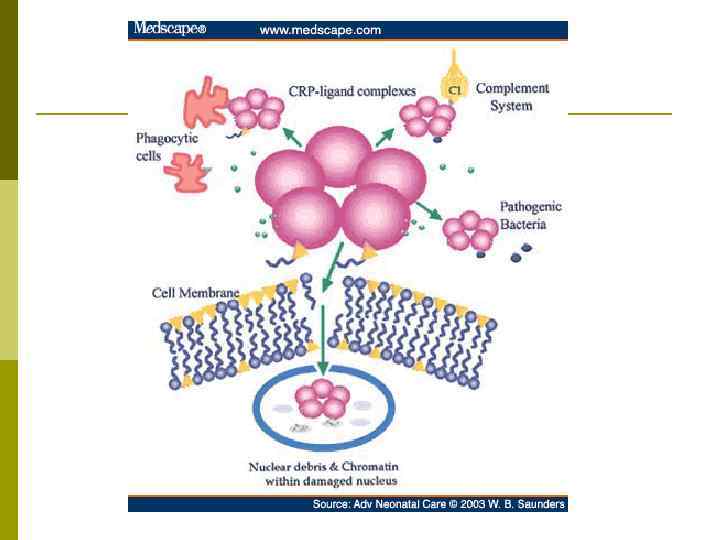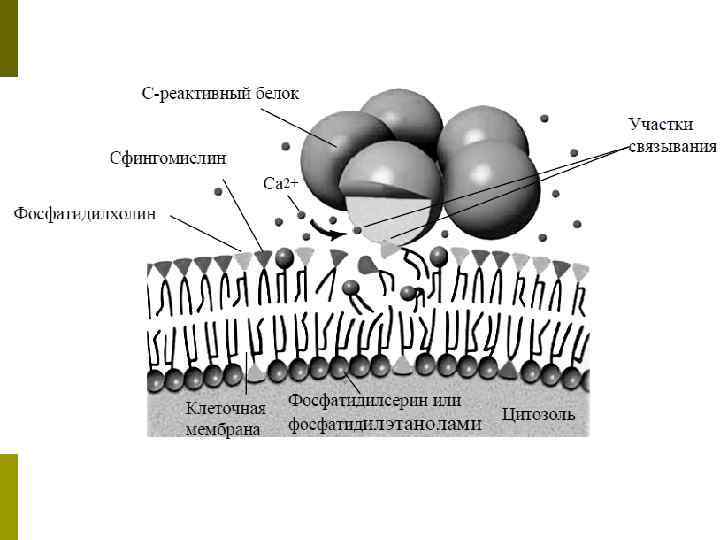 Физиологическая роль СРБ p p p путем кальцийзависимого механизма связывается с остатками фосфорилхолина фосфолипидов и особенно с пневмококковым полисахаридом C; связывается с хроматином и гистоном, принимая участие в клиренсе клеточных остатков; является основным фактором опсонизации – связывается с фагоцитами и ускоряет фагоцитоз антигенов и микроорганизмов; осуществляет экранирование наиболее распространенных аутоантигенных детерминант соединительной ткани (фибронектина, ламинина, поликатионных поверхностей коллагена, ЛПНП и ЛПОНП). связывается с фракцией C 1 q комплемента, обуславливая активацию комплемента по